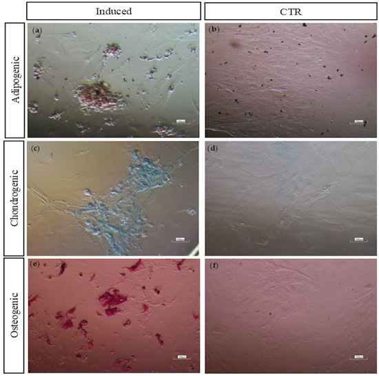 After 3 weeks of adipogenic induction, all isolated cells exhibited adipogenic differentiation, as demonstrated by a morphological transition from spindle-shaped to round or oval-shaped cells. This was accompanied by the presence of intracytoplasmic lipid droplets, confirmed by positive staining with Oil Red O (Figure 6; The original image is published in the Supplementary Materials Figure S6). In contrast, control MSCs maintained their spindle-shaped morphology, forming a monolayer without staining with Oil Red O, confirming the absence of adipogenic differentiation (Figure 6).
