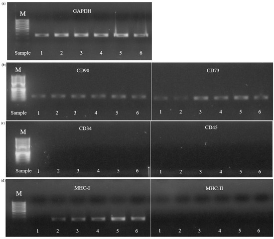 The resulting cDNA was directly subjected to PCR using the 2× EpiArt™ HS Taq Master Mix (Vazyme Biotech Co., Ltd., Nanjing, China). The expression of genes encoding mesenchymal stem/stromal cell markers (CD90 and CD73), hematopoietic markers (CD45 and CD34), and major histocompatibility complex markers (MHC-I and MHC-II) was analyzed. GAPDH was used as a reference gene, as its stable expression has been previously validated in our laboratory under similar experimental conditions [80,81,82]. PCR amplification was carried out using 34 cycles with the following thermal profile: initial denaturation at 95 °C for 5 min; 34 cycles of denaturation at 95 °C for 30 s, annealing at 58 °C for 30 s, and extension at 72 °C for 45 s; and a final extension at 72 °C for 5 min. The specific primers employed for amplification are listed in Table 2 [83,84,85].