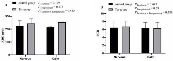 There was no significant difference in the ADG of the calm and nervous groups as well as the tyrosine-supplemented and normal diet groups (p > 0.05, Figure 1A). The ADG of calm sheep with a basic diet was 214.11 g/d, and that of tyrosine-supplemented calm sheep was 255.23 g/d. Similarly, nervous sheep with a basic diet had an ADG of 224.95 g/d, while tyrosine-treated nervous sheep had 244.195 g/d. There was no significant difference seen in the FCR between both the temperament and treatment groups (p > 0.05, Figure 1B). The FCR of calm sheep with a basic diet was 6.3, and that of tyrosine-treated calm sheep was 6.35. Similarly, the FCR of nervous sheep with a basic diet was 6.45, and that of tyrosine-treated nervous sheep was 6.7 (Figure 1B; Supplementary Table S1).