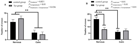 The effect of tyrosine on the number of crosses shown by calm and nervous sheep in the arena test of behavior. n = 6, black bar represents control group, brown bar represents tyrosine group. (A) Test 1, on day 0; (B) test 2, on day 30. Data are expressed as mean ± SEM. **: p < 0.01.