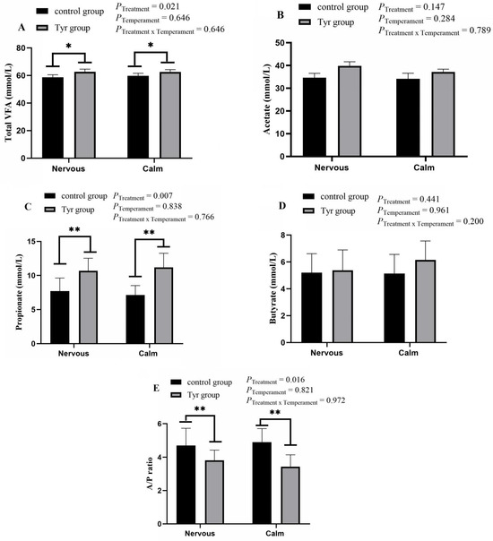 Effect of tyrosine on rumen fermentation parameters of Altay sheep with different temperaments. n = 6, black bar represents control group, brown bar represents tyrosine group. (A) Total volatile fatty acids (TVFAs), (B) acetate, (C) propionate, (D) butyrate, (E) A/P ratio. Data are expressed as mean ± SEM. *: p < 0.05, **: p < 0.01.
