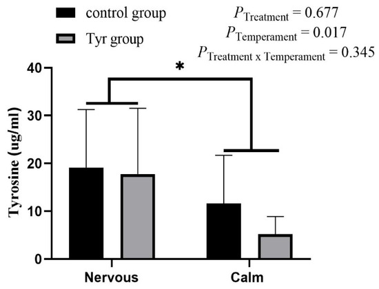 Each sheep was housed in an individual pen (1.25 m × 1 m) for the trial. After an adjustment period of 7 days, animals were housed for 30 days. On the basis of a 2 × 2 factorial method design, calm sheep were randomly divided into two groups: 6 calm sheep were fed a basic diet, and the remaining 6 sheep were supplemented with 4 g of tyrosine per day with a basic diet. Similarly, 6 nervous sheep were fed a basic diet, and 6 nervous sheep were supplemented with 4 g of tyrosine per day along with a basic diet. Tyrosine was purchased from Shanghai Yuanye Biological Co., Ltd. (Shanghai, China) and had a purity of 99%. Animals were fed twice a day at 10:00 and 18:00, while water was available ad libitum. Details of the basal diet composition and nutrient content are provided in Table 1.