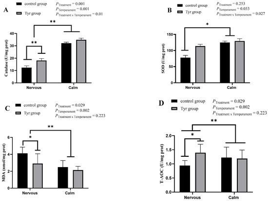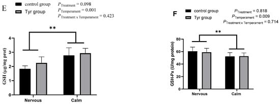 Figure 2 represents the effect of tyrosine on the number of crosses in the arena test of behavior. Sheep from the calm group had a significantly lower number of crosses than the nervous group (p < 0.01) at the first arena test (Figure 2A). Similarly, in the second arena test, calm sheep exhibited a significantly lower number of crosses compared to nervous sheep (p < 0.01; Figure 2B). A significant reduction in the number of crosses was also observed in nervous sheep that received tyrosine supplementation. The number of crosses shown by tyrosine-treated nervous sheep was 8, while the number of crosses shown by basic-diet-fed nervous sheep was 16 (Figure 2B; Supplementary Table S2). On the other hand, tyrosine supplementation increased the number of crosses shown by calm sheep. Overall, a combined interaction of temperament and tyrosine supplementation was seen in the second arena test (p < 0.05, Figure 2B).