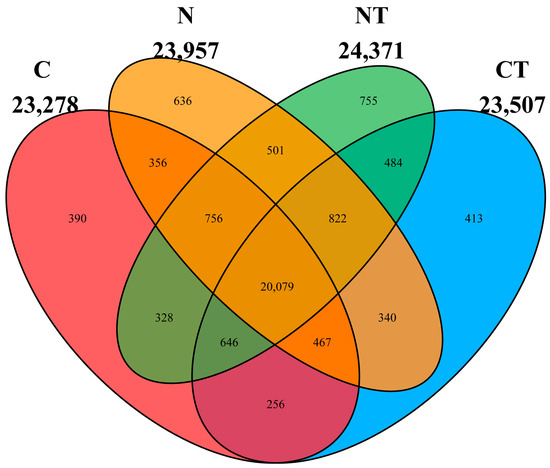 Microbial genes present in different groups. C represents calm group, CT represents calm sheep with tyrosine treatment, N represents nervous group, and NT represents nervous sheep with tyrosine treatment.