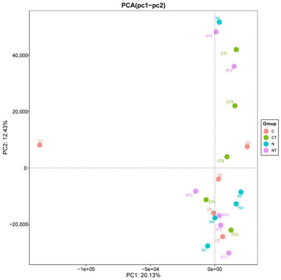 Principal component analysis of the β diversity of the microbiome in Altay sheep with different temperaments. C represents the calm group, CT represents calm sheep with tyrosine treatment, N represents the nervous group, and NT represents nervous sheep with tyrosine treatment.