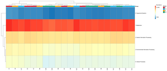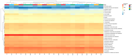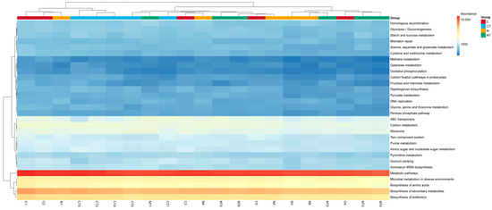 The predictions of bacterial gene functions from KEGG pathway levels 1, 2, and 3 are shown in Figure 10, Figure 11 and Figure 12, respectively. On level 1, the abundant genes identified were related to metabolism and genetic information processing. On KEGG pathway level 2, genes related to global and overview maps, carbohydrate metabolism, amino acid metabolism, signal transduction, and energy metabolism were abundant (Figure 11; Supplementary Table S7). On KEGG pathway level 3, genes related to metabolic pathways, the biosynthesis of secondary metabolites, and the biosynthesis of antibiotics were predicted to be in greater abundance in all samples (Figure 12).
