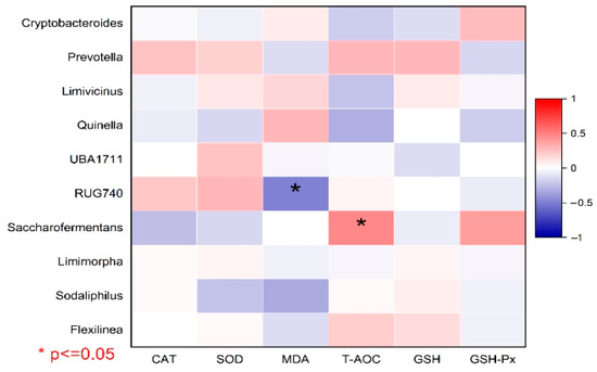 Correlation analysis between abundant microbial genera and rumen epithelium antioxidant properties. A (+1) value represents a positive correlation, and a (−1) value represents a negative correlation. Correlation was considered significant when p ≤ 0.05.