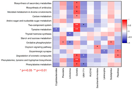 Figure 14 shows the correlation analysis between abundant microbial genera and metabolic pathways on the basis of KEGG functional analysis. The results show that Quinella was positively correlated with phenylalanine, tyrosine, and tryptophan biosynthesis (p < 0.05, Figure 14). It was also found to be positively correlated with tyrosine metabolism and the two-component system. The bacterial genus UBA1711 was negatively correlated with phenylalanine metabolism, the degradation of organic compounds, and the two-component system. Furthermore, the abundance of Cryptobacteroides was negatively correlated with tyrosine metabolism.