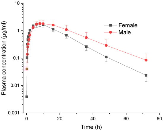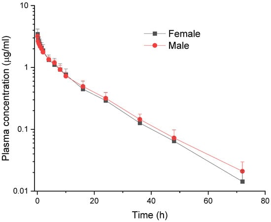 Comparative mean (±SD) plasma concentration vs. time curves of meloxicam in female and male goats following intravenous administration at a dose of 0.5 mg/kg (n = 6).