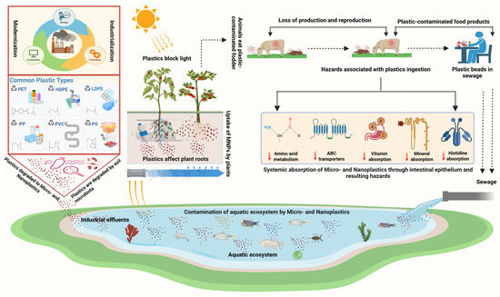This review identifies MNPs as an important consideration and discusses their detrimental impact on plants, and aquatic and terrestrial animals. It also explains the mechanisms of potential MNP influences via ingestion, inhalation, and dermal routes, as well as future challenges and opportunities for MNP waste management. The study of MNP pollution has attracted global interest, and some progress has been made in certain areas. While there are still many difficulties with this growing pollution, this review’s findings provide current and thorough information regarding the properties of MNPs, which may be used to promote future research trends. Based on these findings, various strategies, such as filters, barriers, and clean-up efforts, have been developed to mitigate macro- and microplastic pollution. However, no established methods currently exist for addressing nanoplastic pollution. This represents a critical gap in the literature, emphasizing the need for further research and innovative solutions.