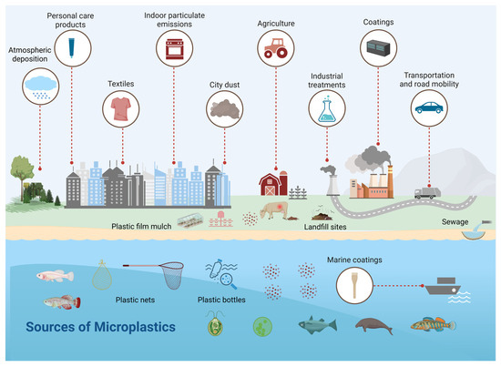 Primary MPs are mass-produced for manufacturing and domestic applications, which include exfoliating facial scrubs, toothpaste, detergents, other personal care products, abrasive cleaning agents, plastic powder for molding, and synthetic clothing (nylon/polyester) [9,10], while paints, adhesives, electronics, etc., are responsible for NP release [11]. Secondary MNPs are formed by fragmentation of macroplastics (200–1000 µM) through shear forces [9,10], and account for 70–80% of all plastic released into the environment, while primary MPs contribute only 15–30% [12,13]. Additionally, synthetic microfibers are often the most commonly reported form of microplastics in environments, from soil to aquatic systems (e.g., oceans, rivers, shorelines, and lakes) [14,15]. Approximately 63% of textile fibers produced are synthetic (e.g., polyester, nylon), and over 42 million tons of synthetic fibers are produced each year by the clothing industry [16], with polyester dominating production (approximately 80%) [17]. As such, Boucher (2017) [18] estimated that of all primary microplastics in the world’s oceans, 35% arise from the laundering of synthetic textiles, an estimated 2–13 million tons per year globally. Without an instant mitigation strategy, plastic pollution in the oceans will be more than 6 million tons by 2040 [19]. Increased plastic accumulation in the environment is due to low degradation rates in addition to unsustainable use and improper disposal [20]. Although the impacts of these ever-present plastics are not fully understood, interest is shifting toward the plastics’ associated hazards in animals (especially food animals) and the environment.