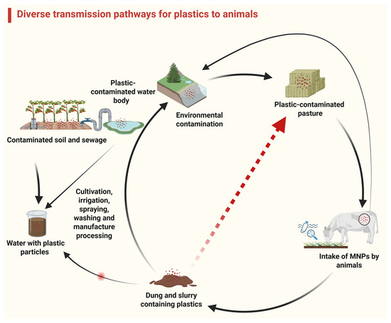 This review aims to provide current perspectives on MNPs concerning (1) the occurrence of issues posed by MNP pollution, including their transmutation routes into animals via ingestion, inhalation, and hide/skin exposure, as well as indirect entry through feed; (2) the toxicokinetic and toxicodynamic of MNPs, highlighting their role as transporters for antimicrobial resistance genes (ARGs), hazardous chemicals, and other pollutants; (3) the impact of MNPs on plant health, aquatic organisms, and livestock productivity, interconnecting human sources of plastic pollution, animals, and environmental health; (4) managemental strategies to mitigate MNPs through current understandings. By integrating recent advances on MNPS-mediated antimicrobial resistance and their effects on livestock health and productivity, this review provides novel perspectives that bridge environmental science and veterinary medicine.