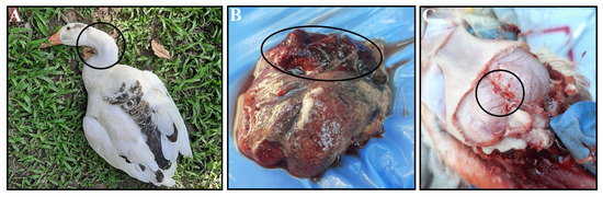 Clinical and postmortem findings in the affected ducks. The affected duck shows (A) torticollis, (B) severe fibrino-hemorrhagic pneumonia, and (C) hemorrhagic brain. All abnormalities are marked with black circles.