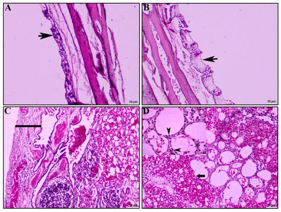 In the affected ducks, different histopathological lesions were observed. In the trachea, the mucosal layer was found thickened due to inflammation (Figure 2A), with profuse mucous secretion and accumulation over or along the mucosal layer (Figure 2B). The inflammatory cells were predominantly lymphocytes. Histopathological examination of the lung revealed pleuritis with the loss of mucosal epithelium (Figure 2C) as one of the predominant lesions, along with pneumonia characterized by marked congestion and hemorrhages, alveolitis with thickened interalveolar septa, diffuse alveolar collapse, a focal loss of pneumocyte I (Figure 2D), and compensatory proliferation of pneumocyte II (Figure 2D: inset box).