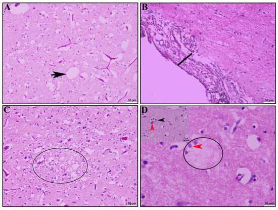Histopathological lesions of brain. (A) Severe congestion and numerous vacuoles (black arrow) within brain parenchyma. (B) Meningoencephalitis characterized by marked thickening of the meninges. (C) Focal to diffuse encephalitis with encephalomalacia (circle) and (D) encephalomalacia (circle) accompanied by neuronophagia (inset, black arrowhead), and neuronal necrosis (red arrowhead); H & E stain; scale bar indicates magnification.