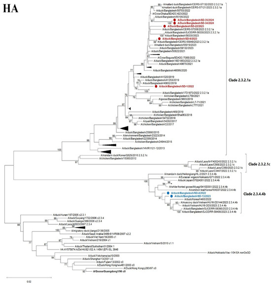 Contemporary H5N1 sequences from Bangladesh, along with representative highly pathogenic avian influenza virus (HPAIV) field strains, were retrieved from public databases including the NCBI GenBank and GISAID. Multiple sequence alignments were performed using the online version of MAFFT (https://mafft.cbrc.jp/alignment/server/; accessed on 21 January 2025). Maximum likelihood trees were generated using the GTR model incorporated in MEGA XII software, with branch support assessed through 1000 bootstrap replicates. Final tree visualizations and annotations were completed using MEGA XII [36] and Inkscape 1.0 (https://inkscape.org; accessed on 25 January 2025). The obtained full-genome sequences of seven Bangladeshi H5N1, A/duck/Bangladesh/SD1/2022(SD1), A/duck/Bangladesh/SD4/2022(SD4), A/duck/Bangladesh/SD9/2023(SD9), A/duck/Bangladesh/SD13/2023(SD13) A/duck/Bangladesh/SD22/2023(SD22), A/duck/Bangladesh/SD34/2024(SD34), and A/duck/Bangladesh/SD35/2024(SD35), were deposited in the GISAID database with the accession number mentioned in Supplementary Table S1.