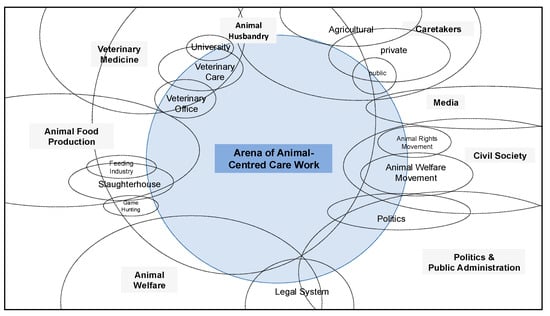 In this article, we explore the tensions inherent in professions that work with and care for animals. In doing so, the multiple stakeholders and expectations that shape animal-centred care are taken as our starting point. The argument is based on two major empirical studies: Study I examines the multi-dimensional aspects of killing in farm animal medicine, highlighting the ethical, emotional and practical demands placed on practitioners []. Study II focuses on human–animal interactions in different contexts, particularly in sanctuaries, with a particular emphasis on the challenges and complex negotiations inherent in caring []. These empirical perspectives allow us to trace how instrumental and relational care are enacted, justified, and negotiated in two highly contrasting institutional settings. To analyse these tensions, we draw on Clarke’s [] situational analysis and the social worlds/arenas theory developed by Strauss []. This theoretical framework offers tools for analysing how groups interact within specific social domains. Social worlds are dynamic, permeable groupings of actors connected through shared activities and identities, continuously shaped by processes of interaction and negotiation. Social arenas are understood as focused spaces of negotiation in which different social worlds (conflictually) exchange views on topics to assert their interpretations and, in some cases, assert them against others. The theory is characterised by the multi-perspectivity of social situations. This approach allows us to conceptualise animal-centred care as a negotiated practice shaped by overlapping actor constellations, institutional logics, and material conditions.
