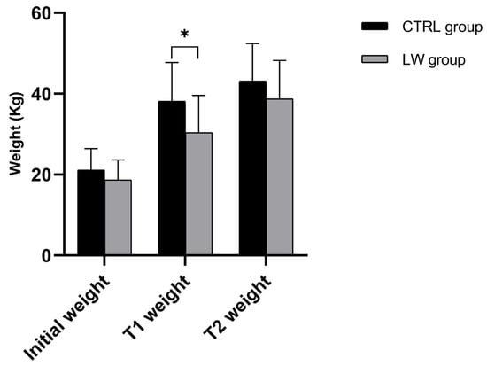 | Initial Weight (T0) | 21.1 ± 5.3 kg | 18.7 ± 4.9 kg | Independent t-test | 0.15 | 0.47 |