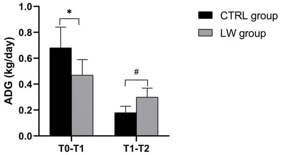 | T1 → T2 ADG (kg/day) | 0.18 ± 0.05 | 0.30 ± 0.07 | Welch’s t-test | 0.02 | 1.98 |