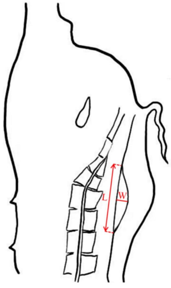 Schematic representation of the gluteus medius anatomical location and measurement protocol. L represents gluteus medius length and W represents gluteus medius width.