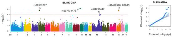Based on these findings, we performed GWAS focusing specifically on GMA. Unlike traditional GWAS models (e.g., MLM), the BLINK algorithm employed here reduces false positives by iteratively adjusting for population structure and linkage disequilibrium []. The BLINK model demonstrated higher statistical power than the conventional MLM model []. Our crossbred population, derived from Landrace and Yorkshire lineages, enhances allele diversity and improves detection power for minor-effect loci. This genetic heterogeneity enables more robust identification of trait-associated variants within complex architectures, significantly increasing GWAS resolution. Furthermore, we employed estimated breeding values (EBVs) rather than raw phenotypic measurements for GWAS, as EBVs incorporate genomic relationships to increase detection power [].