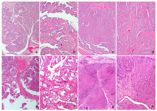 Cat, hematoxylin and eosin. (a,b) Intraductal papillary adenoma. (c,d) Ductal adenoma. (e,f) Intraductal papillary carcinoma. (g,h) Ductal carcinoma.