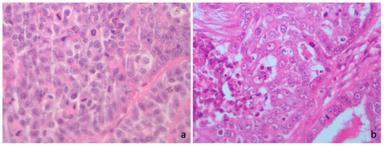 In 1957, the first numerical grading system was introduced [61], based on which, 34 years later, Elston and Ellis (EE) published what would become the gold standard for the histological grading of invasive human breast cancer [62]. The EE histological grading system has been widely applied by veterinary pathologists and researchers in the grading of FMC [20,27,30,55,63,64,65] and encompasses a semi-quantitative assessment of three morphological features, namely tubule formation, nuclear pleomorphism, and mitotic count (Table 4). A numerical score between 1 and 3 is allocated to each parameter, and the total score is used to attribute the tumor grade: grade I (3–5 points; well-differentiated), grade II (6–7 points; moderately differentiated), or grade III (8–9 points; poorly differentiated) [62]. According to literature reports, FMC grade II is usually the most prevalent, accounting for up to 58.3% of the cases [14,56,63,64,66]; however, one study reported grade III as the predominant histological grade, encompassing 59.2% of the cases [30]. While most solid carcinomas are moderately to poorly differentiated, tumors exhibiting tubulopapillary patterns are mainly well to moderately differentiated [27,63,64]. Furthermore, EE grade I carcinomas have predominantly been observed in smaller tumors (median 1.1 cm) and younger (median 10 years) cats, whereas grade III carcinomas were more frequent in larger tumors (median 3.0 cm) and older cats (median 12 years) [27].