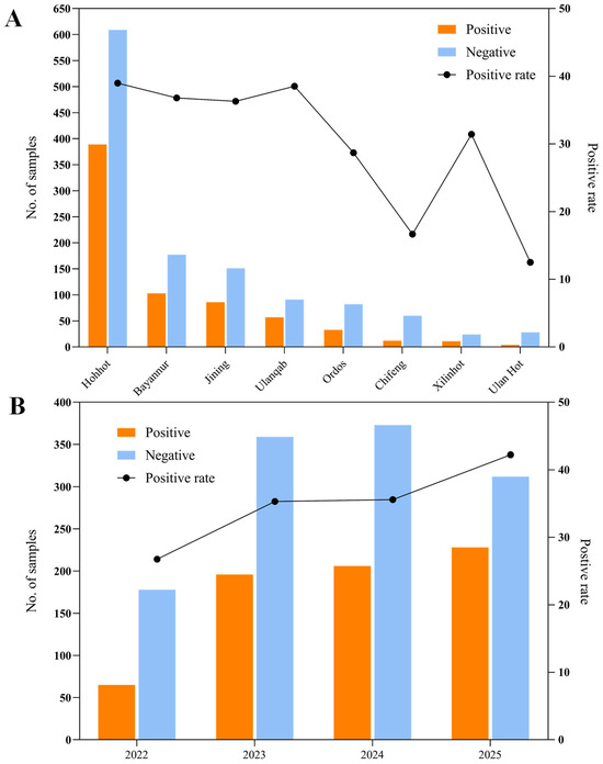 Geographic and temporal distribution of bovine rotavirus (BRV) cases in China. (A) Spatial distribution of BRV-positive and BRV-negative samples across various Chinese cities. (B) Yearly trends in BRV positivity rates from 2022 to 2025, illustrating temporal changes in detection rates over the study period.