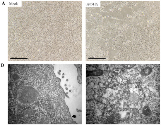 Characteristics of the 0205HG isolate cultured from MA104 cells. (A) CPEs induced by 0502HG in MA104 cells. (B) Electron microscopy images of purified BRV particles.