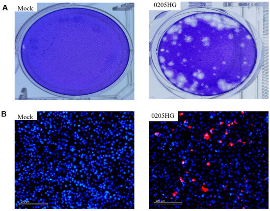 Infection dynamics of the 0205HG isolate in MA104 cells. (A) Representative plaques of isolate-infected MA104 cells. Mock and 0205HG-infected MA104 cells at 72 h. (B) Red fluorescence was detected in MA104 cells at 12 h post infection with the isolate.