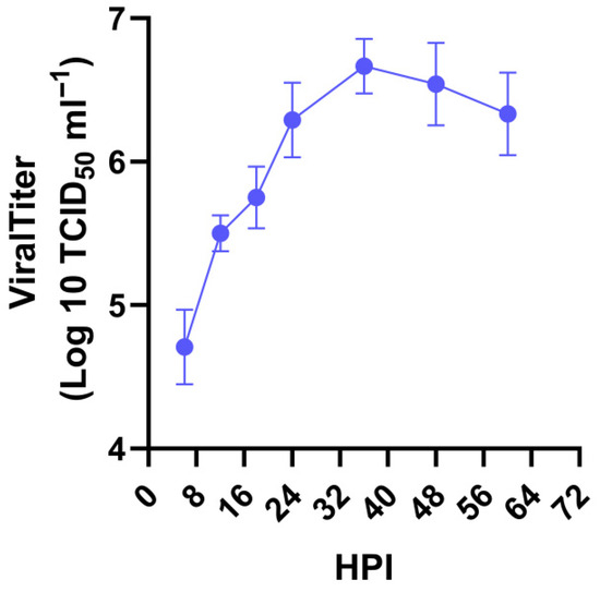 The growth curve of the 0205HG strain was plotted at various time points post infection on the basis of the TCID50. The results revealed a rapid increase in the titer from 6 to 36 h post infection (hpi), with virus titers reaching approximately 1 × 106.66 TCID50/mL for the 0205HG strain (Figure 4).