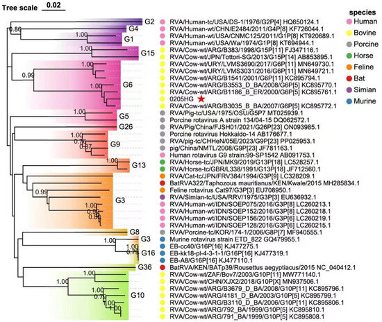 Phylogenetic analysis of the VP7 gene sequence of BRV. The trees were created via neighbor-joining analysis via MEGA 11 software with 1000 bootstrap replicates. The red five-pointed star denotes the VP7 sequence of the 0205HG isolate.
