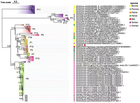 The genotyping of all complete viral genome segments was conducted using the Rotavirus A Genotype Determination Tool provided by the Virus Pathogen Database and Analysis Resource (ViPR) [29]. Relevant sequences matching the targeted genomic segments were retrieved from the NCBI nucleotide database (Supplementary Table S1) and subjected to multiple sequence alignment using the ClustalX v1.83 algorithm. Subsequently, phylogenetic trees for the whole-genome sequences were generated via Molecular Evolutionary Genetics Analysis (MEGA) software version 6.06, employing the neighbor-joining method with 1000 bootstrap replicates [30]. Trees were exported in Newick format and visualized with iTOL (https://itol.embl.de (accessed on 1 June 2025), which allowed for interactive annotation and color-coding [31].