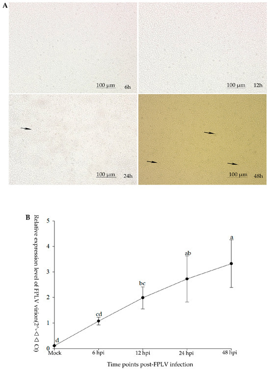 The growth kinetic analysis of FPLV infection in F81 cells. (A) Observation of cytopathic effect (CPE, indicated by black arrows) on FPLV-infected F81 cells in different hours post-infection (6 hpi, 12 hpi, 24 hpi, and 48 hpi). (B) Quantitative-PCR analysis of transcript levels of FPLV over time post-infection. Different lowercase letters indicate significant differences at the 0.05 level among different time points post-FPLV infection.