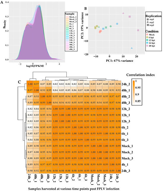 Analysis of gene expression for different FPLV infection times. (A) Fragments per kilobase per million fragments (FEAM) density distribution (density plot) of RNA-seq data. (B) Principal component analysis (PCA) of gene expression. (C) Inter-sample correlation analysis of gene expression.