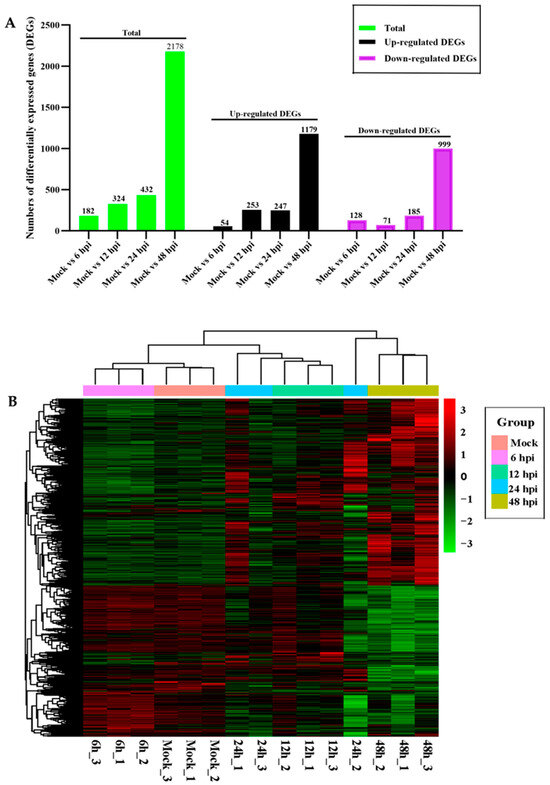 The statistical results for differentially expressed genes (DEGs) between various treated groups are presented in Figure 3A. Based on a comparison to the control group (CK), a total of 3116 DEGs were identified in samples collected at various hours post-infection (hpi). This includes 182 DEGs (54 up-regulated and 128 down-regulated) at 6 hpi, 324 DEGs (253 up-regulated and 71 down-regulated) at 12 hpi, 432 DEGs (247 up-regulated and 185 down-regulated) at 24 hpi, and, significantly, 2178 DEGs (1179 up-regulated and 999 down-regulated) at 48 h post-infection.