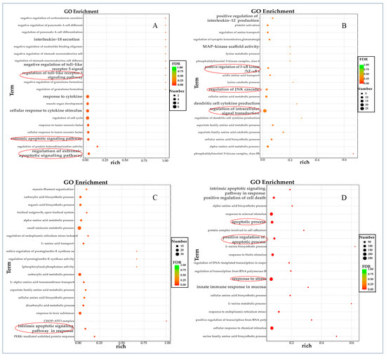 Gene ontology (GO) enrichment analysis of up-regulated genes at different time points post-FPLV infection (hpi). (A) GO analysis of up-regulated genes at 6 hpi. (B) GO analysis of up-regulated genes at 12 hpi. (C) GO analysis of up-regulated genes at 24 hpi. (D) GO analysis of up-regulated genes at 48 hpi.
