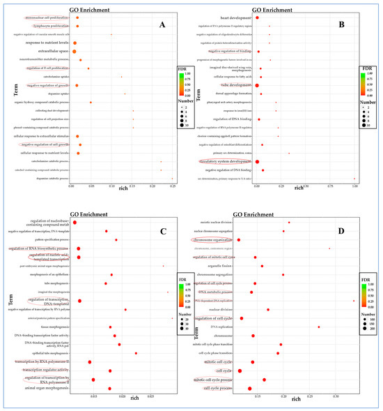 The down-regulated differently expressed genes (DEGs) are predominantly enriched in the processes related to the immune response to virus invasion, such as mononuclear cell, lymphocyte, and B-cell proliferation, during the early stages of virus infection (6 hpi). As the infection progressed, the down-regulated DEGs began to be enriched in cellular functions, specifically negative regulation of binding and tube development at 12 hpi (Figure 5B). This trend continued in subsequent periods of virus infection, with an enrichment in transcription processes at 24 hpi (Figure 5C) and the cell cycle at 48 hpi (Figure 5D).