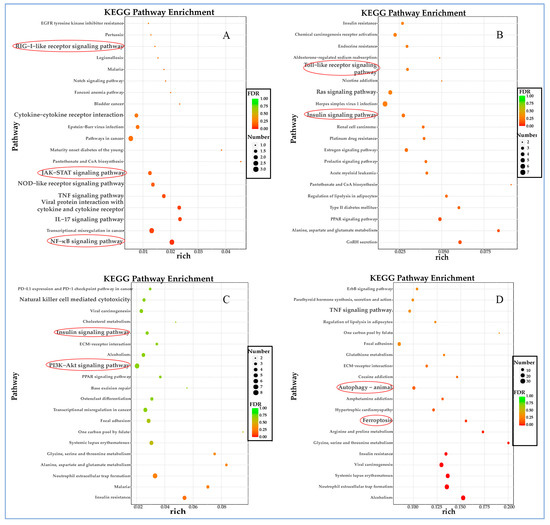 Multiple innate immune signaling pathways are activated after 6 h of infection of F81 cells with FPLV, such as NF-κB, NLR, RLR, TNF, IL-17, and JAK-STAT signaling pathways (Figure 6A). Genes associated with TLR, TNF, and Ras signaling pathways are up-regulated up to 12 h post-infection (hpi) (Figure 6B). Transcript abundance for genes involved in insulin; phosphatidylinositol 3-kinase (PI3K)-serine/threonine protein kinase (AKT) (PI3K-AKT); mitogen-activated protein kinases (MAPK) signaling pathway; and Th1, Th2, and Th17 cell differentiation increased at this time point (24 hpi). Additionally, genes associated with natural killer cell-mediated cytotoxicity and amino acid metabolism are also up-regulated (Figure 6C). At 48 h post-infection, the TNF and insulin signaling pathways remain continuously activated, and autophagy and ferroptosis, a novel cell death mode, are observed (Figure 6D).