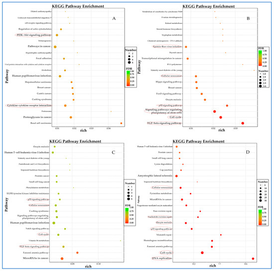 The results of the KEGG analysis for the down-regulated DEGs are presented in Figure 7. During the early stage (6 hpi) of virus–host interaction, the down-regulated DEGs were primarily enriched in the PI3K-Akt signaling pathway and cytokine–cytokine receptor interaction (Figure 7A). As the experiment progressed, the down-regulated DEGs played a significant role in cellular senescence, the p53 signaling pathway, and the cell cycle at 12 (Figure 7B) and 24 hpi (Figure 7C). This trend persisted throughout the duration of the experiment (48 hpi) (Figure 7D).