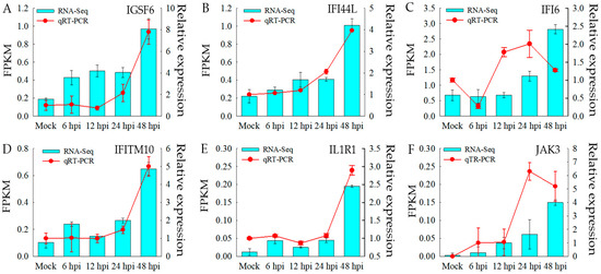 The expression of six up-regulated differentially expressed genes (DEGs) related to the innate immune response pathways was validated using real-time RT-PCR (Figure 8). For example, IFI44L gene expression was up-regulated by 1.31, 1.87, 2.17, and 4.92 times at 6 h, 12 h, 24 h, and 48 h compared to the baseline in the RNA-seq data, respectively. At the same time, the corresponding values in the RT-qPCR results are 1.07, 1.19, 2.05, and 3.95 times, respectively. Moreover, the expression patterns of IGSF6, IFITM10, IL1R1, JAK3, and IFI6 are in line with the trends observed in the transcriptome sequencing data.
