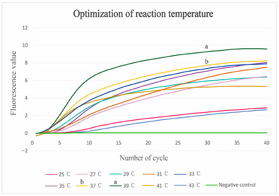 Optimization for Fluo-RAA assay. The Fluo-RAA assay is conducted at various temperatures. The fluorescence value of curve “a” is highest at 39 °C, whereas curve “b” comes second at 37 °C. The fluorescence values of all curves are lower, within the temperature ranges of 25–35 °C and 41–43 °C.