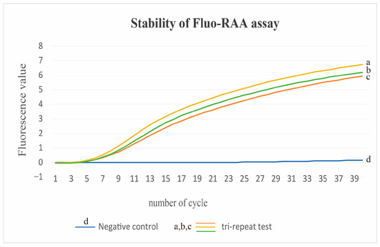 Stability test for Fluo-RAA assay. Three identical tests were carried out on the positive samples, yielding consistent reaction curves for a, b, and c, all derived from the same sample. Meanwhile, d represents the reaction curve of the negative control.