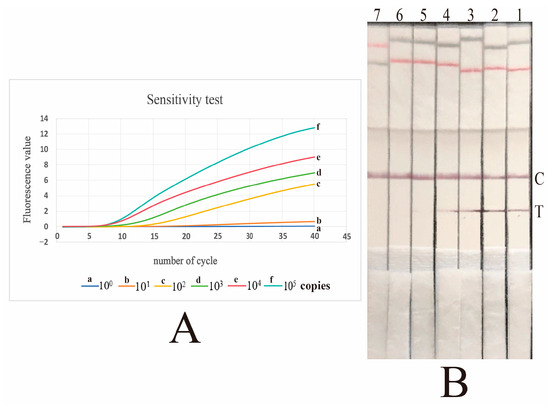 Sensitivity tests for Fluo-RAA and LFD-RAA assays. (A): The sensitivity test for the Fluo-RAA assay. The “a, b, c, d, e, and f” represent six distinct curves obtained by conducting the Fluo-RAA assay using various copies of DNA as the DNA template. The “a, b, c, d, e, and f” are 100 copies, 101 copies, 102 copies, 103 copies, 104 copies, and 105 copies, respectively. The sample from curve “a” is detected as negative by the Fluo-RAA assay, whereas all the samples from curves “b, c, d, e, f” are detected as positive by the same assay. (B): The sensitivity tests for the LFD-RAA assay. “C” represents the control line, and “T” denotes the detection line. The seven dipsticks labeled “1, 2, 3, 4, 5, and 6” correspond to the detection results obtained from various DNA template copies, with the number of DNA copies being 105 copies, 104 copies, 103 copies, 102 copies, 101 copies, and 100 copies, respectively. Additionally, “7” denotes the detection outcome from distilled water. The four dipsticks labeled “1, 2, 3, and 4” exhibit a positive result, whereas the three dipsticks labeled “5, 6, and 7” show a negative result.