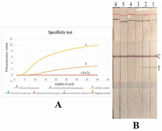 The specificity tests for the Fluo-RAA and LFD-RAA assays. (A): The specificity test for the Fluo-RAA assay. The “a, b, c, d, e, and f” represent six distinct curves obtained by conducting the Fluo-RAA assay using various copies of DNA as the DNA template. The curves labeled “a, b, c, d, e, f, and g” represent distinct curves obtained through the conducted Fluo-RAA assay using various DNA templates. The DNA templates are derived from positive plasmids, Glaesserella parasuis, Actinobacillus pleuropneumoniae, Pasteurella multocida, Bordetella bronchiseptica, and Actinobacillus indolicus, and a negative control, respectively. Out of these, only the curves from positive plasmids and Glaesserella parasuis exhibit positive results, while all other curves are negative. (B): The specificity test for the LFD-RAA assay. The dipsticks labeled “1, 2, 3, 4, 5, and 6” represent the detection result obtained through the conducted LFD-RAA assay using various DNA templates. The DNA templates are derived from positive plasmids, Glaesserella parasuis, Actinobacillus pleuropneumoniae, Pasteurella multocida, Bordetella bronchiseptica, and Actinobacillus indolicus, respectively. Only the detection results obtained from positive plasmids and Glaesserella parasuis are positive, whereas all other detection results are negative. In this context, “C” denotes the control line, while “T” signifies the detection line.