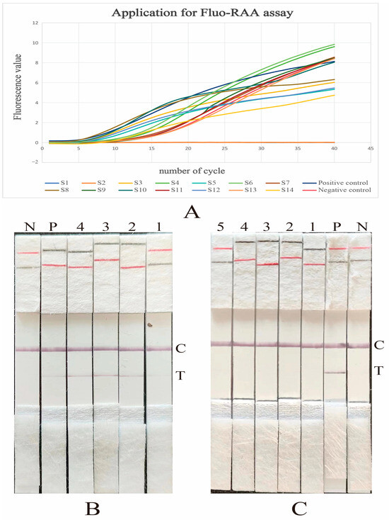 Application test for Fluo-RAA and LFD-RAA assays. “N” denotes negative control, “P” signifies positive control, and “C” indicates control lines for LFD quality assurance. (A): Application test for the Fluo-RAA assay. The “S1–S14” represent 14 distinct samples. (B): Application test for positive samples in the LFD-RAA assay; “1–4” represent 4 distinct positive samples. (C): Application test for negative samples in the LFD-RAA assay; “1–5” represent 5 distinct negative samples.