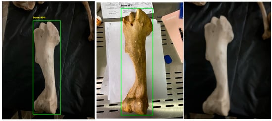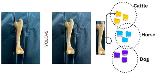 The trained YOLO model was used to scan bone images placed sequentially on a table from various angles, and the cropped images were recorded under the corresponding animal class (Figure 1).