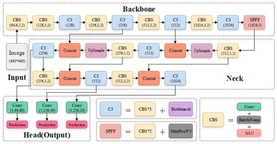 Secondly, to enhance information flow, YOLOv5 employs a Path Aggregation Network (PANet) in its neck section []. PANet improves low-level feature propagation using a bottom-up approach and introduces a new Feature Pyramid Network (FPN) topology. Additionally, an adaptive feature pooling method connects the feature grid across all feature levels, allowing for meaningful information obtained from each feature level to be transferred to subsequent subnetworks. Furthermore, the YOLO layer, which forms the head of YOLOv5, generates feature maps at three different scales to enable multi-scale prediction, enabling the model to process small, medium, and large-sized objects effectively (Figure 3).