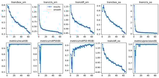 During the training of the YOLOv5s model, the input image size was set to 640 × 640 pixels. Although the training was initially scheduled for 150 epochs, an early stopping mechanism was triggered at the 65th epoch due to the stabilization of performance metrics and to prevent the risk of overfitting. The Adam optimizer was employed with an initial learning rate of 0.01 and a momentum value of 0.937. To enhance the accuracy of bone detection, several data augmentation techniques were applied: mosaic augmentation (100%) combined multiple bone samples into a single image to improve the model’s generalization capability; the mix-up technique (15%) mitigated overfitting by smoothing transitions between classes; and manipulations in the HSV color space (H: 0.015, S: 0.7, V: 0.4) improved robustness against varying lighting conditions. All hyperparameters are detailed in Table 3.