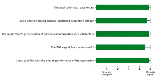 The 98% satisfaction rate obtained from student surveys further highlights the educational potential of the system. Previous studies, such as those by Mayfield et al. [], have shown that mobile technologies can effectively support anatomical education. This study not only reinforces those findings but also demonstrates the potential of creating active learning environments that support individualized learning.